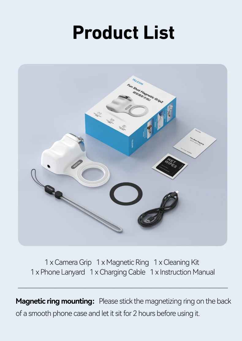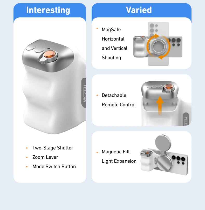 TELESIN Magnetic Phone Camera Shoot Hand Grip – stabilize your smartphone for professional-quality photos and videos. This versatile phone holder features a secure magnetic mount compatible with iPhone, Huawei, Samsung, and most smartphones. The ergonomic grip design reduces hand fatigue during extended shooting sessions, while the integrated remote control handle lets you capture hands-free shots with precision. Perfect for vlogging, content creation, live streaming, and everyday photography. Lightweight and portable, it transforms your phone into a capable camera rig.