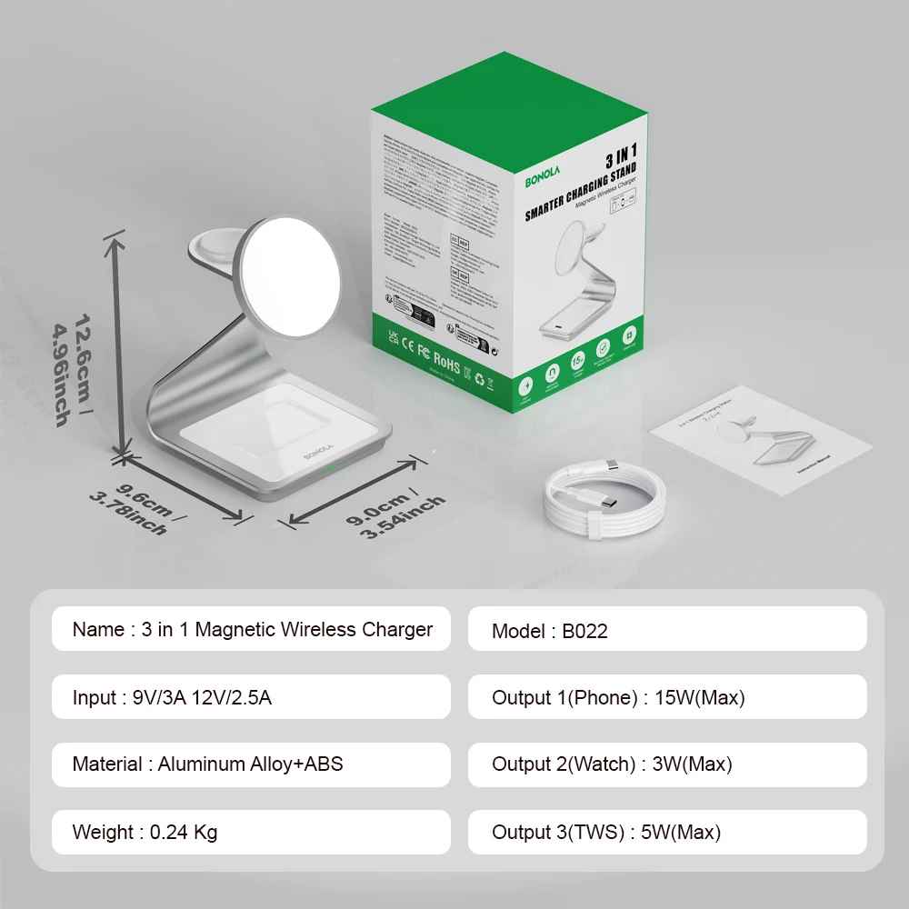 Charge three devices simultaneously with the Bonola Magnetic 3-in-1 Wireless Charger. This sleek charging station powers your iPhone 17/16/15/13/14/12, Apple Watch, and AirPods Pro at once with 30W fast wireless charging. The magnetic alignment ensures secure positioning and efficient power delivery. Perfect for nightstands or desks, it eliminates cable clutter while keeping all your essential devices ready to go. Compatible with most cases, this compact multi-device charger is the ultimate convenience solution for Apple users.