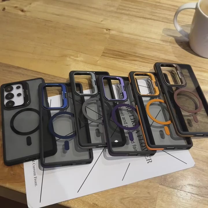 COMITOK Magnetic Lens Stand Cover for Samsung Galaxy Ultra/Plus offers premium protection with integrated MagSafe compatibility. Features a reinforced metal lens guard that shields your camera from drops and scratches while maintaining crystal-clear photo quality. The built-in magnetic stand allows hands-free viewing for videos, calls, and content consumption. Engineered with shock-absorbing bumper technology to protect against impacts. Compatible with Galaxy S25, S24, S23, S22 Ultra and Plus models. Durable design combines style with functionality for everyday protection.